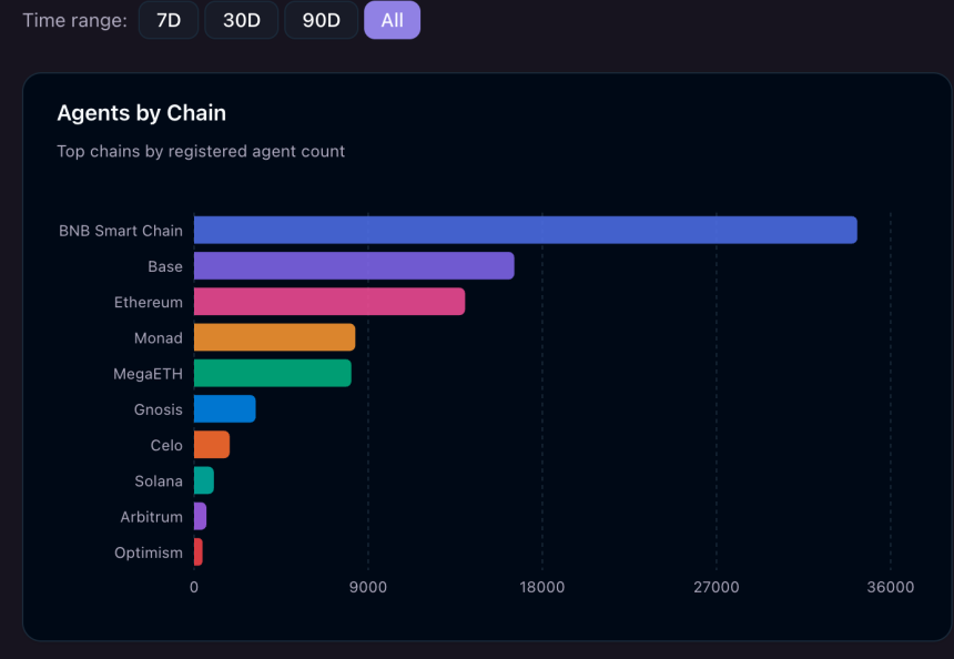 Data from Agentscan shows BSC leading with 39,000 agents, and Base and Ethereum nearly tied at between 28K-30K on-chain agents using the ERC-8004 standard.