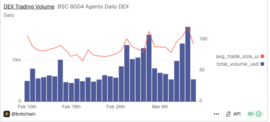 Agent-driven trading volume across decentralized exchanges on $BNB Chain since February also reached a daily high yesterday, March 11, of over $18.1 million.