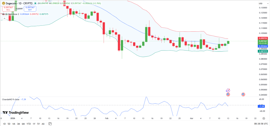 Dogecoins 1-day chart shows improving short-term conditions as price trades above the Bollinger Bands basis near $0.0937. It also continues to recover from the lower band around $0.0876.