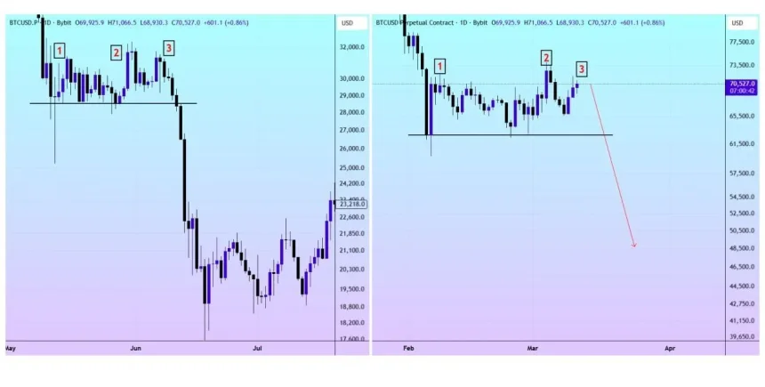 Why the concern? Analysts point to a pattern in the current chart structure that closely resembles a fractal seen during the 2022 crypto bear market. That historical pattern unfolded in several stages before prices dropped sharply.