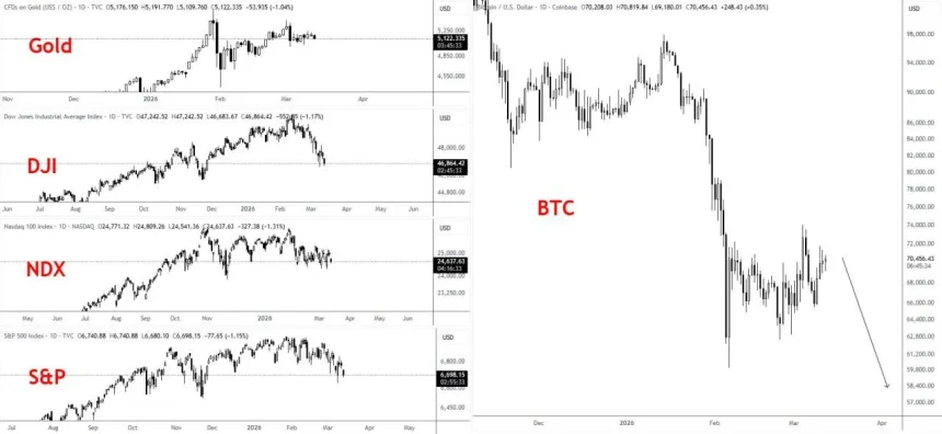 This combination of weakening equities and sideways commodities has prompted some analysts to question whether crypto markets have fully absorbed the broader shift in sentiment.