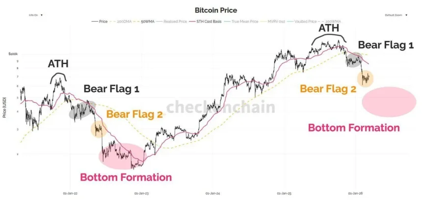 Chart watchers often study past market cycles to identify repeating structures. One pattern attracting attention today mirrors a bearish flag formation that appeared during the 2022 downturn.