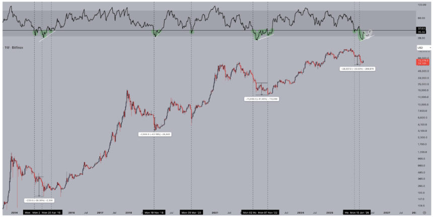 The analyst also examined Bitcoins relative strength index indicator, which has repeatedly provided clues about when bear markets are nearing completion, in another post. Jelle observed that every previous bear market eventually bottomed when the weekly RSI dropped below the 37 level. Once the indicator crosses below that threshold, it often falls further before the Bitcoin price reaches its final low.