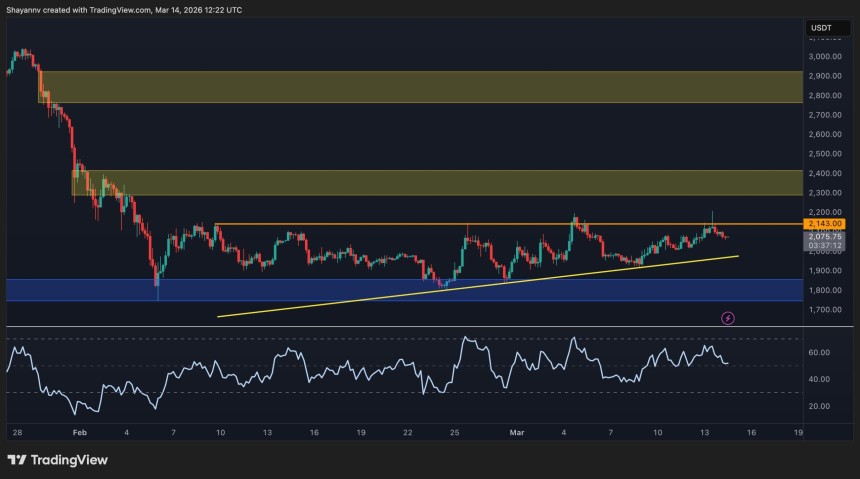 What matters now is the repeated test of $2,143. The asset has reached that level several times, which usually makes the next reaction important. A decisive move through it could trigger a fast push into the next supply zone around $2,400 and possibly higher. Another rejection, however, would likely keep $ETH rotating sideways and send it back toward the trendline and the $1,800 support area.