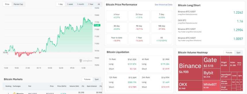 After recovering from the severe correction that drove prices into the mid-$60,000 range earlier this year, Bitcoin is currently essentially stuck in the $72,000 range, moving sideways. In contrast to earlier breakout attempts, trading activity has remained muted during the recent push above resistance, which took place in comparatively calm market conditions.