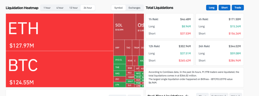 The move had a short squeeze behind it. CoinGlass data shows $344 million in total liquidations over the past 24 hours across 91,978 traders, with short liquidations accounting for $284.9 million, roughly 83% of the total. Ether shorts got hit hardest at $127.9 million, followed by bitcoin at $124.5 million and solana at $18.5 million.