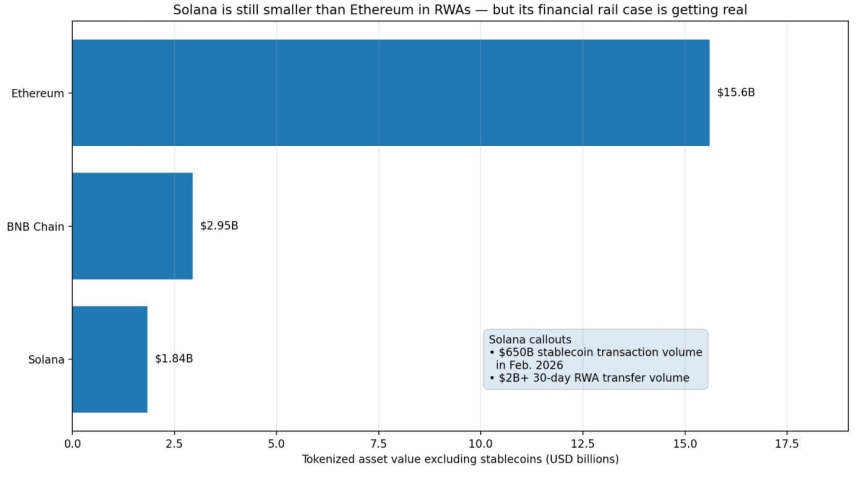 Ethereum still holds about $15.6 billion in tokenized asset value excluding stablecoins, according to RWA.xyz, compared to Solana's $1.84 billion. BNB Chain sits between them at roughly $2.95 billion.