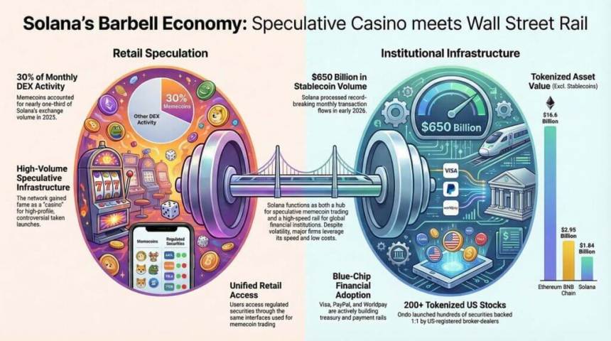 Solana turns six with both identities intact. The memecoin casino still operates at full volume, while Wall Street built its infrastructure on top of it anyway.