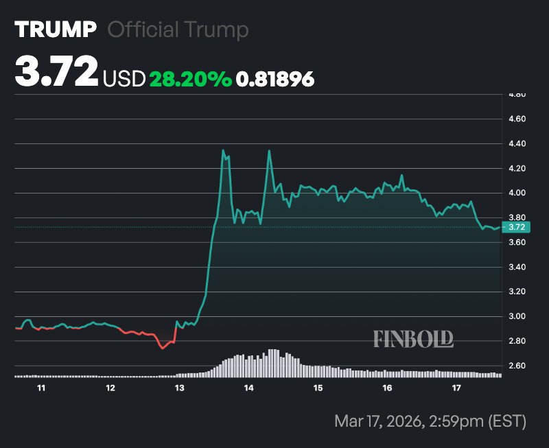 Notably, the announcement of the second gala has boosted momentum for the $TRUMP token, which rose as much as 60% in a day, climbing from around $2.70 to above $4 before settling in the mid-$3 range. By press, $TRUMP was trading at $3.72, down over 4% in the past 24 hours, while on the weekly timeline, the cryptocurrency has rallied almost 30%.