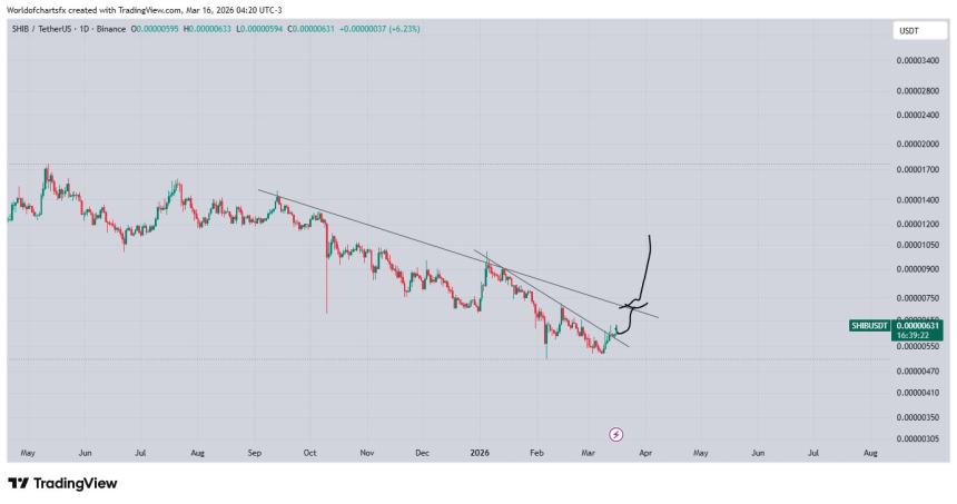 A shared chart shows this happened on March 13, following a push to an intraday high of $0.00000630. Notably, this downward-facing line had suppressed $SHIB‘s price since the January 5 high of $0.00001009, before last week’s breakout.