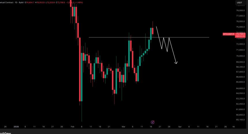 According to the analysts chart, if Bitcoin loses support, the next level to watch is below $69,000, 7.1% from the current $74,263.