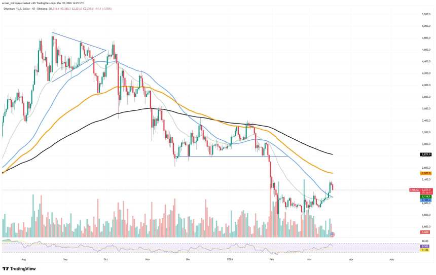 Ethereum has recently started to form a recovery structure following a steep decline earlier this year that drove the price below several significant support levels. The asset is currently trading in the $2,200-$2,300 range after rising from lows close to the $2,000 area. Shorter-term moving averages have begun to converge as a result of this rebound, raising the prospect of a technical crossover.
