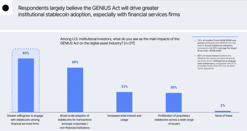 Part of that momentum is being driven by US regulatory developments, with 83% of respondents saying the passage of the GENIUS Act will increase financial institutions willingness to engage with stablecoins. More than two-thirds (69%) said the law will drive broader adoption of stablecoin-based transactions.