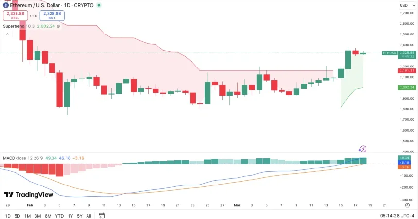 Ethereums daily chart is displaying a significant bullish development as the price recently broke above the Supertrend indicator. Throughout February and most of March, the descending Supertrend line acted as overhead resistance, steadily declining and capping rallies.