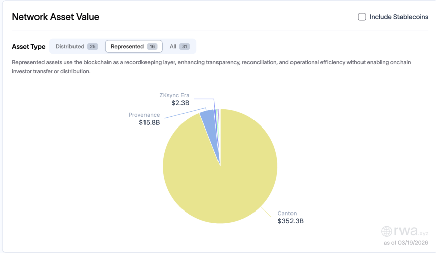 Canton dominates the represented side at $352 billion. And that number itself dwarfs Ethereum $16 billion. But that figure is not fund inflows or investor-held capital. It is institutional record-keeping on a closed network.