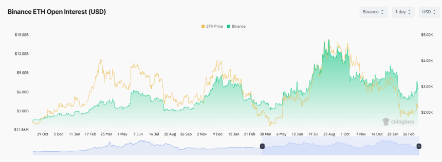 Data from Coinglass shows that Ethereums Open Interest on Binance has increased by $1.5 billion since the beginning of the month, reaching $6.6 billion. However, it still remains far below the more than $12 billion recorded in October last year.