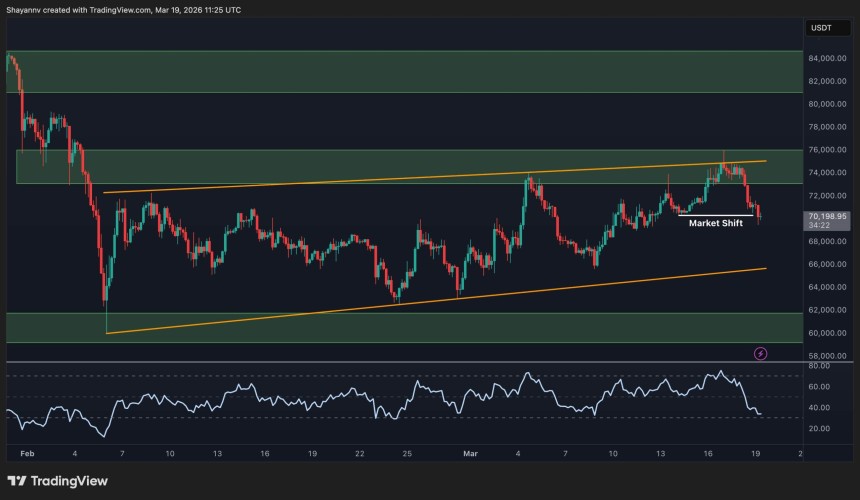 The daily RSI has recovered from deeply oversold territory, currently oscillating around the midline. A key horizontal support zone between $58K and $62K (highlighted in blue) held during the February capitulation wick, and that area remains the most critical floor to watch. For any meaningful reversal, however, the market would need to reclaim the $75K–$80K zone, which also aligns with the descending channels upper boundary.
