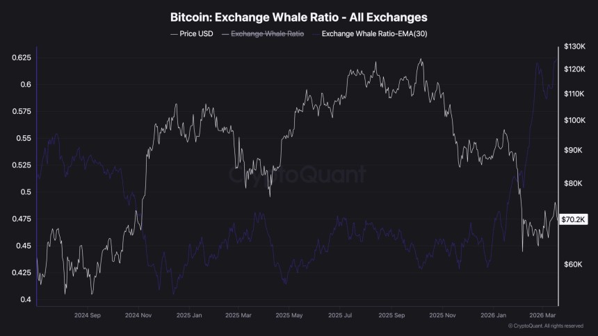 The Exchange Whale Ratio, measuring the proportion of large transactions relative to total exchange inflows, has shown a notable spike in recent weeks. After months of relatively subdued whale activity during the prolonged downtrend, the ratio has jumped sharply from around 0.45 to above 0.6, signaling that large holders are becoming more active on exchanges.