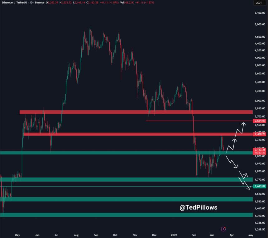 On the social media commentary end, analyst Ted Pillows said Ethereum faced a strong rejection from the $2,400 resistance zone. It is now retesting the $2,150 level, which may act as immediate support.