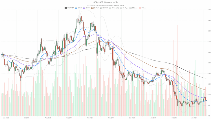 Until Solana either convincingly reclaims the 50-day EMA and pushes toward $95 or higher, or loses the $88–$89 shelf and slides toward the lower Bollinger Band, the dominant force here is mean reversion, not trend. In this kind of environment, risk, volatility, and uncertainty are the real drivers. Any position needs to be sized with the understanding that the market can easily overshoot both supports and resistances before choosing a direction that sticks.
