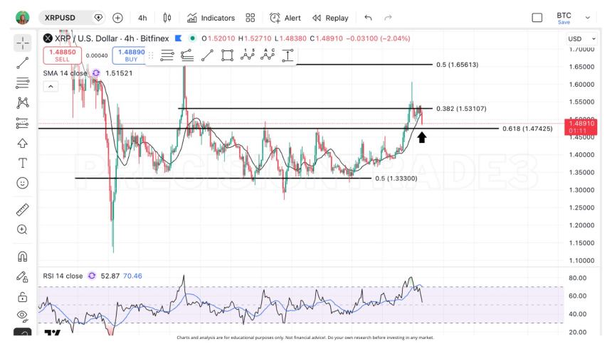 According to Tara, $XRP is testing an important support level around $1.47. This level is significant because it aligns with a key Fibonacci retracement (0.618), which traders often monitor.