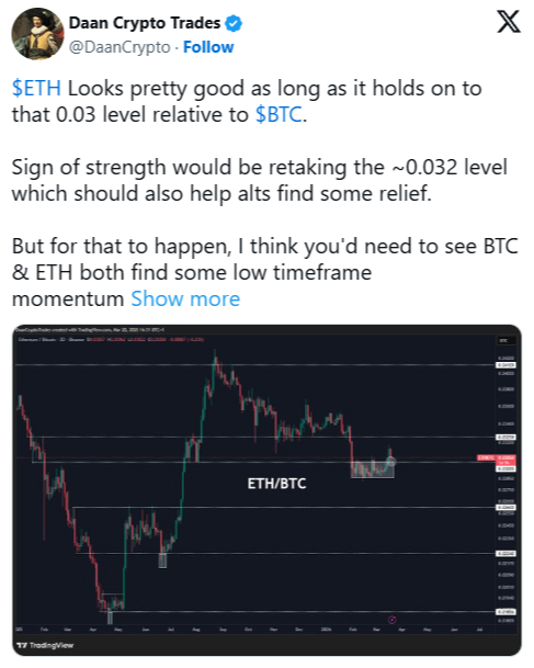 WikiBit 2026-03-22 06:02The $ETH/$BTC pair is sitting at 0.03050 as of March 21, 2026, and analyst Daan Crypto Trades says t