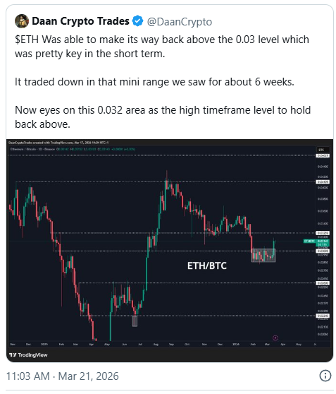 The $ETH/$BTC pair is sitting at 0.03050 as of March 21, 2026, and analyst Daan Crypto Trades says that level needs to hold. On the two-day chart, $ETH/$BTC has been in a prolonged downtrend since peaking above 0.04100 in mid-2025. It was lower through the second half of the last year and into early 2026 before finding what looks like a short-term floor in the 0.03000 to 0.03005 range. The current price is barely above that floor, and the market context around it is firmly risk-off.