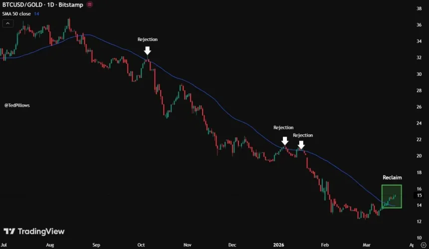 A chart shared by Ted Pillows shows the $BTC to Gold ratio moving back above its 50 day simple moving average for the first time since October 2025. Earlier rallies into that line ended in rejection, but the latest move shows the ratio reclaiming it instead, which points to a possible shift in relative strength.