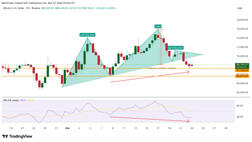 Bitcoin ($BTC) price dropped 6% over the past week to trade near $68,100 after breaking a head-and-shoulders neckline on March 21.