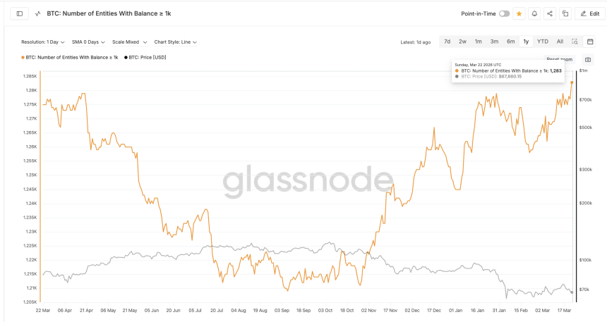 Despite the breakdown, Bitcoin whales are adding to their positions rather than exiting. The number of entities holding at least 1,000 $BTC rose to 1,283 as of March 22, according to Glassnode data. That is the highest reading in one year. The climb has been steady since early March, but it accelerated after the neckline break on March 21, when the count jumped from roughly 1,277 to 1,283. At a minimum, that implies roughly 6,000 $BTC were added in two days. Small yet notable as it shows whale optimism.