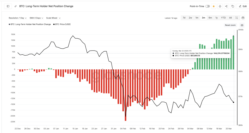 Long-term holders, those who have held for more than 365 days, are following the same playbook. The daily long-term holder net position change flipped positive in early March and reached 144,374 $BTC by March 22, up from 129,262 $BTC on March 21. Thats a near 12% increase in accumulation.