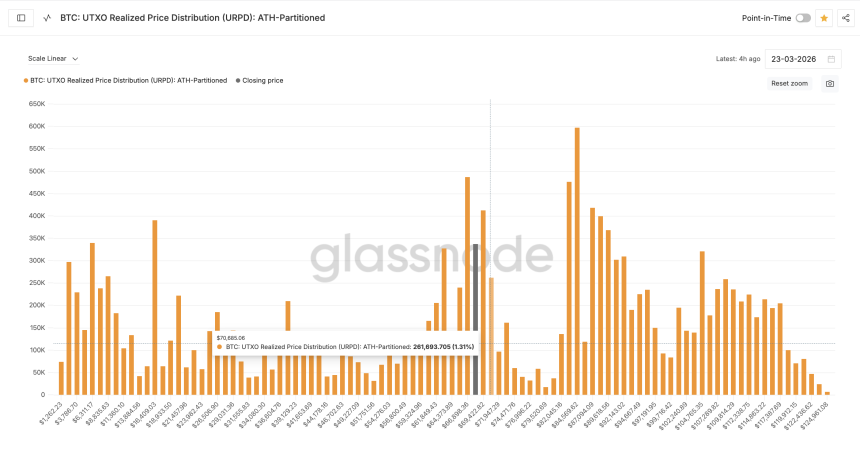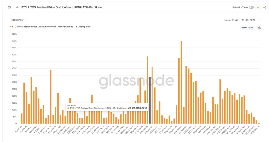 The UTXO Realized Price Distribution (URPD), a metric that maps where Bitcoin supply last moved on-chain, reveals two dense clusters sitting directly above the current price. At $69,400, roughly 411,953 $BTC (2.06% of total supply) last changed hands. Just above that, at $70,600, another 261,694 $BTC (1.31%) are concentrated.
