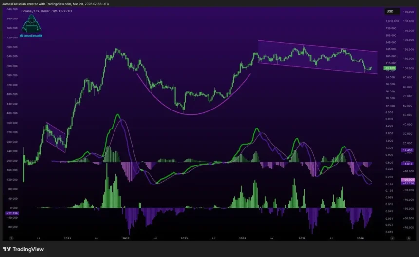 A chart shared by James Easton shows Solana trading inside a descending channel after a broader recovery, while momentum indicators below the price chart suggest bearish pressure may be easing. The setup combines a rounded base structure with a consolidation phase, which often appears when an asset pauses before its next larger move.