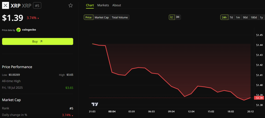 WikiBit 2026-03-23 07:04$XRP ($XRP) fell 3.74% to $1.39 on March 22, trading 62% below its July 2025 all-time high of $3.65,