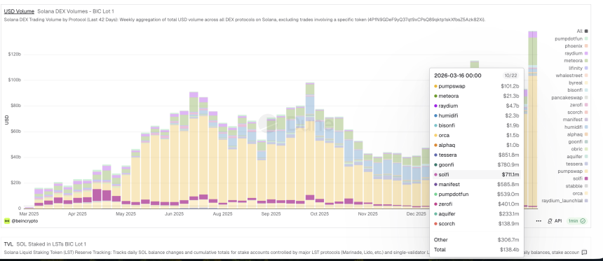 The weekly DEX volume data from BeInCrypto‘s exclusive Dune dashboard shows a dramatic reversal. Pumpswap alone accounted for $101.2 billion of the $138.4 billion total, followed by Meteora at $21.3 billion and Raydium at $4.7 billion. The February trough at $68.1 billion coincided with Solana’s steepest price losses, when $SOL fell from $149 to roughly $67 between mid-January and early February.