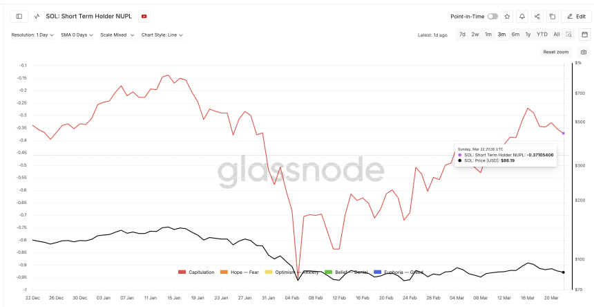 The net unrealized profit/loss for short-term holders (NUPL), a Glassnode metric measuring whether recent buyers are sitting on gains or losses, shows an interesting shift. When $SOL hit its $67 low in early February, the short-term holder NUPL stood at roughly -0.95, deep in the capitulation zone. By March 22, it had risen to -0.37.