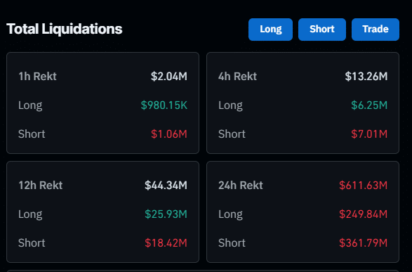 For the broader crypto market, Coinglass shows that a staggering $611 million has been wiped out in the last 24 hours. Short positions led with $361 million, while longs accounted for $249 million.