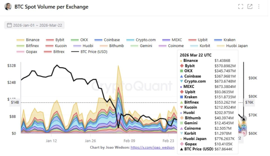 Binance has dominated Bitcoin ($BTC) spot trading volume with $1,438,600,000 as of March 22, 2026.
