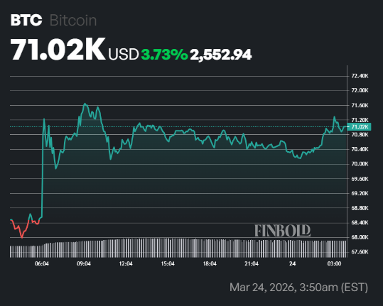 This surge in total market activity corresponded with a notable move in Bitcoins price. During the same 24-hour period leading up to the time of publication, Bitcoin gained by approximately $2,552 per coin, representing an uptick of 3.73%, to trade at around $71,020 at press time.