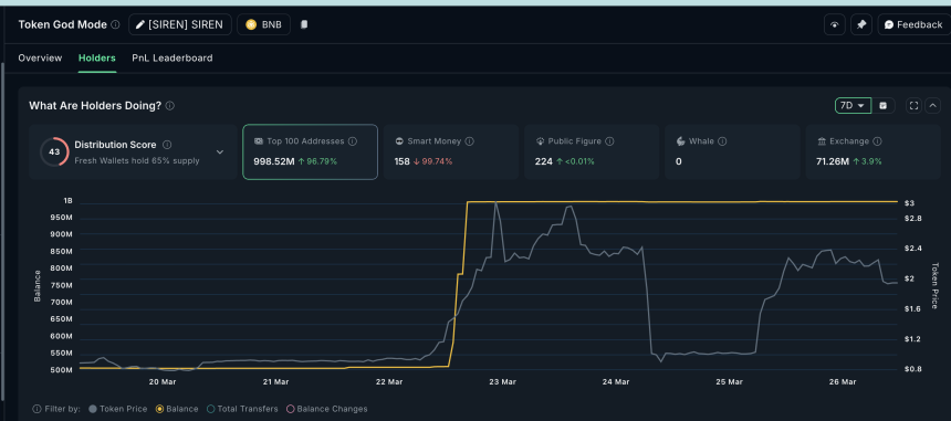 At the same time, the top 100 addresses increased their combined balance to 998.52 million $SIREN, a 96.79% jump. This concentration raises a centralization risk where a small number of wallets control enough supply to move prices sharply in either direction.