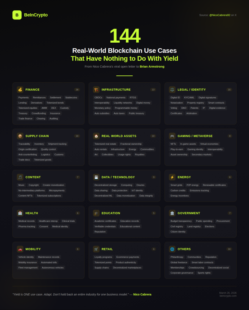 Yield is just 1 of 144 blockchain use cases. So why is one company holding up an entire industry? Crypto analyst Nico Cabreras viral open letter to Brian Armstrong lays it out.