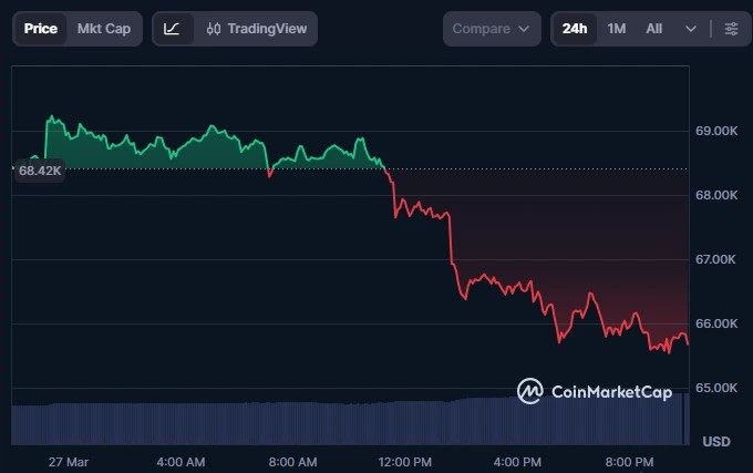 WikiBit 2026-03-28 06:02Bitcoin ($BTC) has plummeted below $66K, trading at $65,675 at press time, which is a 3.98% drop in