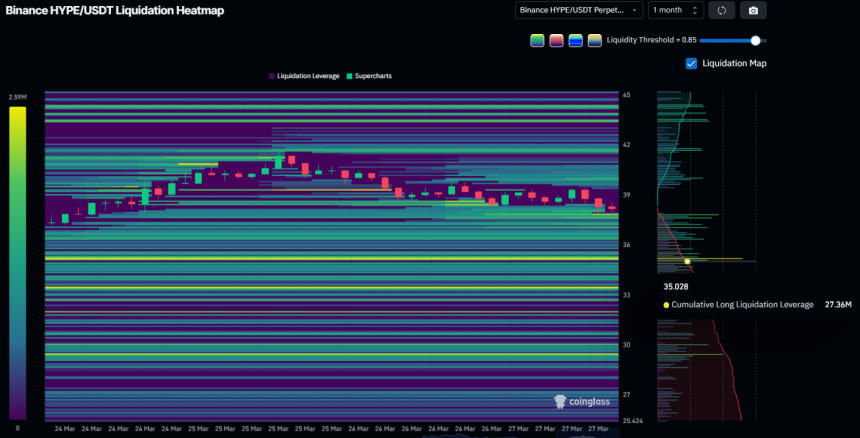 The $HYPE liquidation heatmap shows a dense band of leveraged long positions clustered around $35.03. Cumulative long liquidation leverage at that level totals $27.36 million.