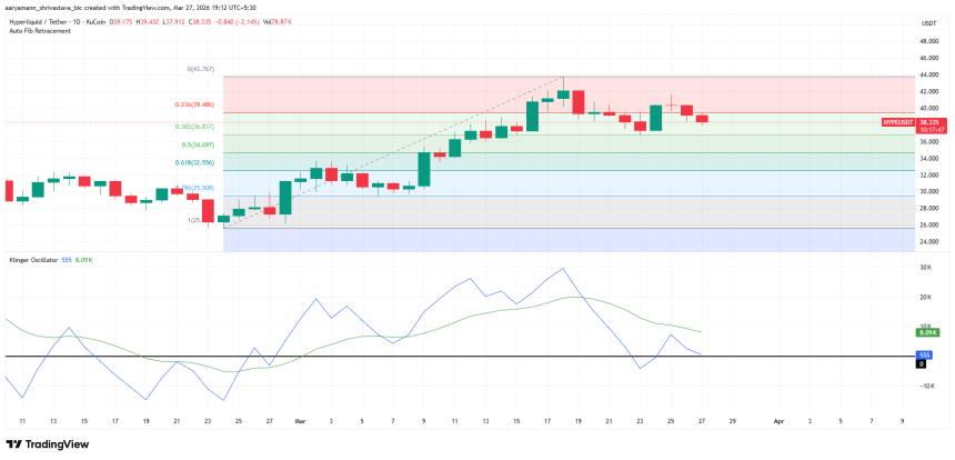 WikiBit 2026-03-28 06:01Hyperliquid ($HYPE) price is trading at $38.27, down 2.31% on the day, as a completed double top pat