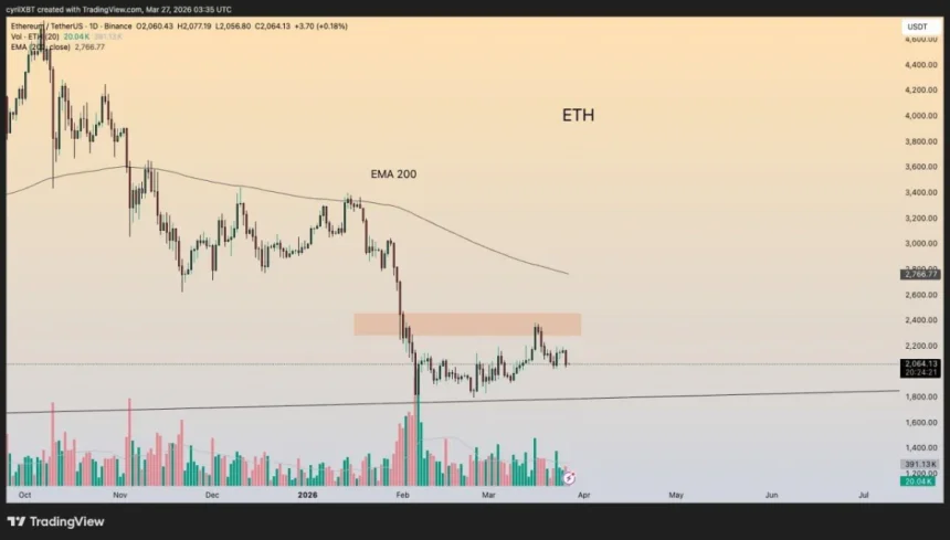 Ethereum remained in a weak technical position after failing to break through a key supply zone, according to a chart shared by CyrilXBT. The daily chart showed $ETH trading well below its 200 day exponential moving average, with the broader trend still tilted lower after a steep drop from above $4,000 to the $1,700 area.