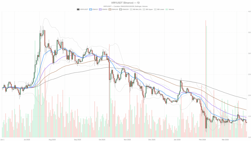 $XRP is trading below the 20, 50, and 200-day EMAs, with each EMA stacked above the next (20 < 50 < 200 in price terms). That is a textbook bearish alignment and shows the downtrend is established, not a one-day shock. For bulls, the first serious sign of life would be a reclaim of the 20-day EMA around $1.41; until then, every bounce is technically a rally into resistance.