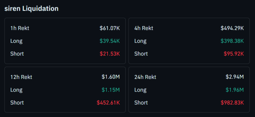 At these levels, traders built $891.08K worth of long positions and $1.79 million worth of short positions. This suggested that bullish interest in $SIREN might be fading as bears continue to dominate the memecoin.