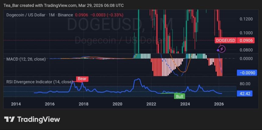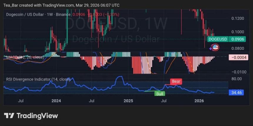 Technically, Dogecoin is approaching a crucial moment. The weekly chart shows price stabilizing around $0.0906after weeks of consolidation. Indicators are beginning to hint at a shift beneath the surface.