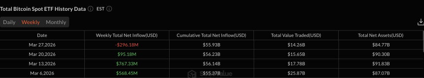 However, the weekly breakdown tells a different story. The week of March 6 brought $568 million in inflows. March 13 surged to $767 million. March 20 slowed to $95 million. And the week ending March 27 flipped red at -$296 million.