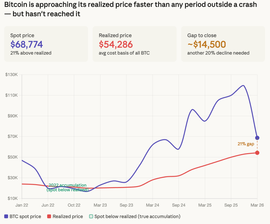 CryptoQuant data shows bitcoin's realized price, the average cost basis of all coins on the network weighted by their last transaction, sitting at $54,286. Spot trades at $68,774 on the same chart. That puts the gap at roughly $14,500, or about 21% above realized.